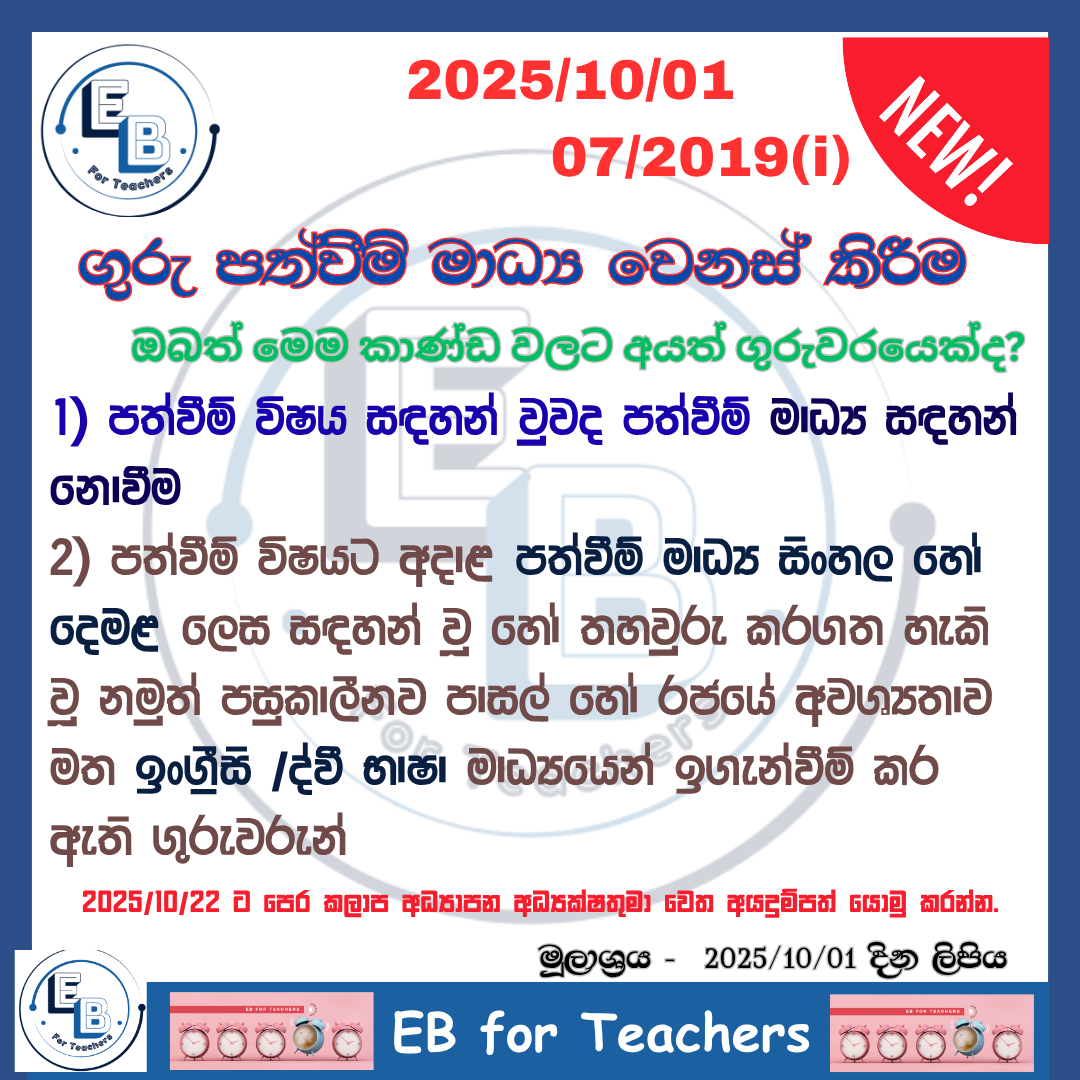 පත්වීම සිංහල හෝ දෙමළ මාධ්ය වුවද පසුකාලීනව පද්ධතියේ රජයේ අවශ්යතාව මත අඛණ්ඩව පූර්ව අසන්නයෙන් වසර පහක් ඉංග්රීසි / ද්වී භාෂා මාධ්යයෙන් ඉගැන්වීම් සිදුකර ඇත්නම් පත්වීම් මාධ්ය ඉදිරියට ඉංග්රීසි ලෙස තීරණය කිරීම (නමුත් රාජ්ය පරිපාලන චක්ර රේඛ විසි නමය අනුවට යටතේ ඉංග්රීසි භාෂාව සඳහා භාෂා දීමනාව ලබා ගැනීමට එය බාධාවක් කර නොගත යුතු වේ)